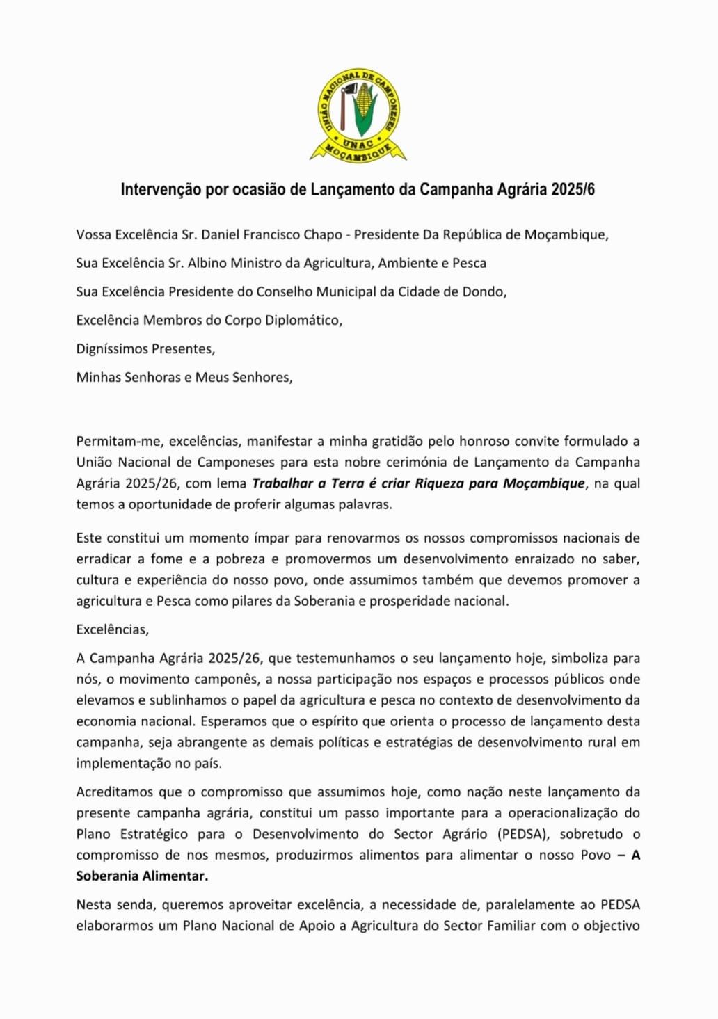 Mensagem Alusiva ao Lançamento da Campanha Agrária 2020/26