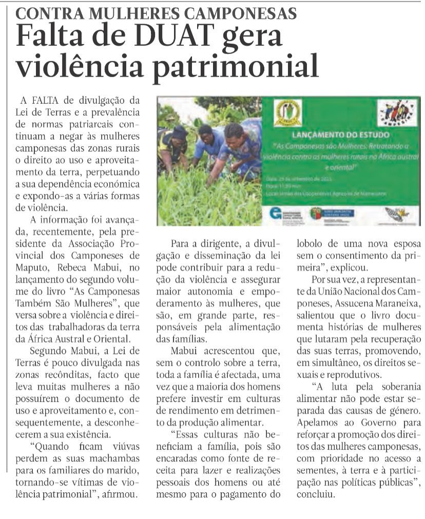 UNAC LANÇA SEGUNDO VOLUME DO ESTUDO AS CAMPONESAS SAO MULHERES EM MARRACUENE
