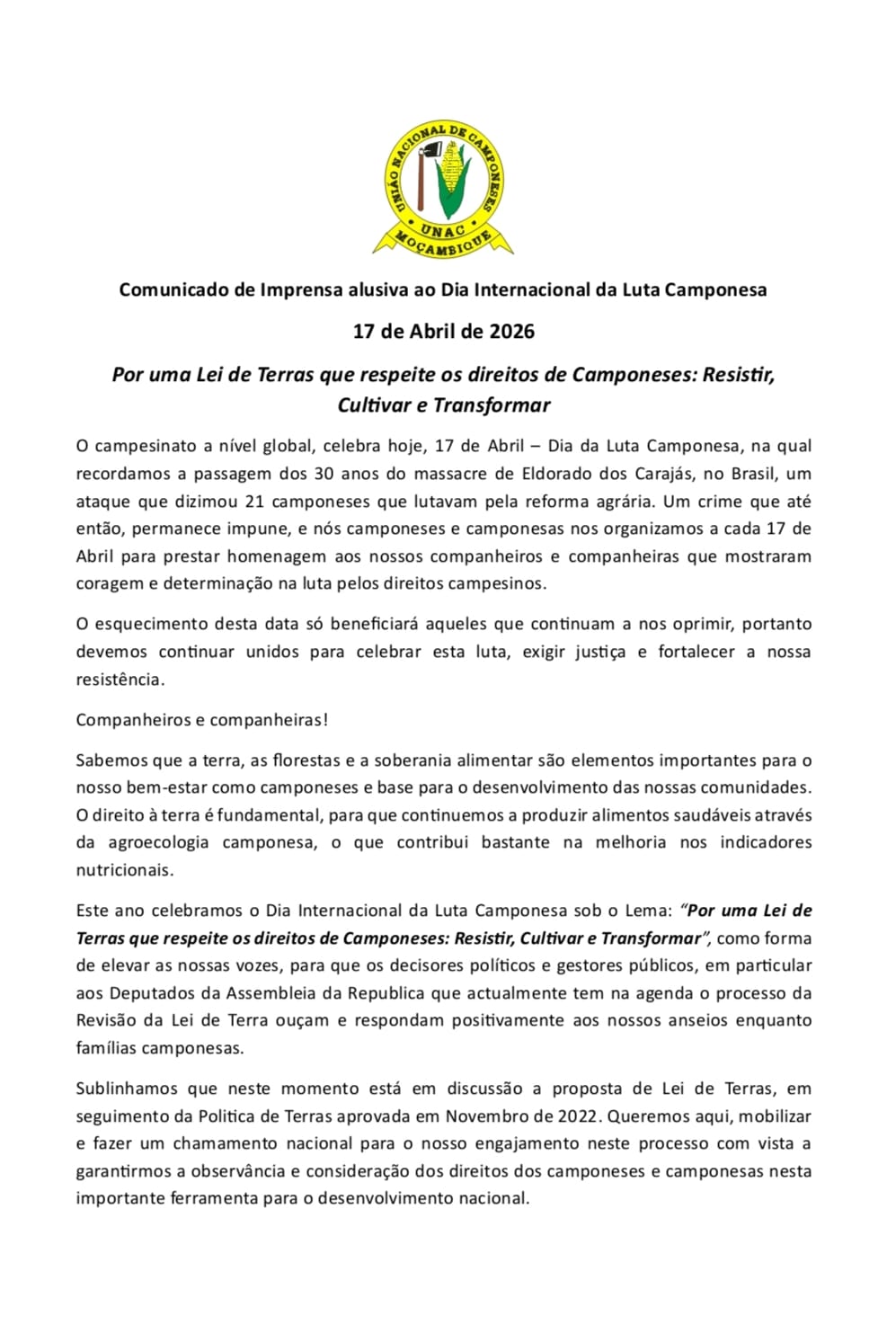 UNAC REALIZA MARCHA ALUSIVA AO DIA INTERNACIONAL DA LUTA CAMPONESA No quadro das celebrações do Dia Internacional da L[...]